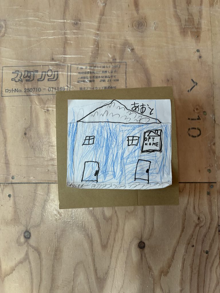 お家のイラストです。2世帯なのでドアが2つ。青色は養生のブルーシート。すごい上手!