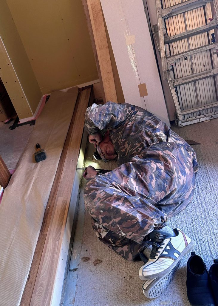 玄関の框の裏側も筆で丁寧に塗っていきます。既製品と違い框の色も床の色と合わせていくので細かいところまで気を使わなくてはなりません。