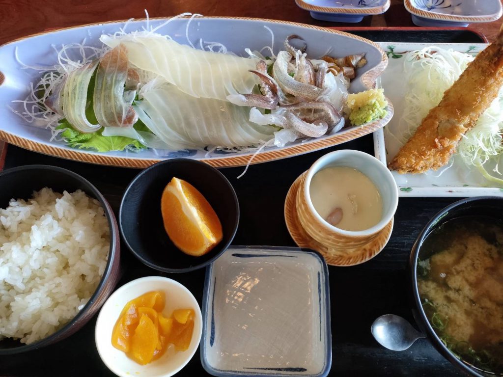 活きイカの定食、お目当てのお店は休みだったけど食べられて満足でした✨足がグニャグニャ動いてました!