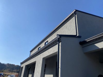 冬晴れの青空がよりいっそう塗り壁の雰囲気を際立たせます