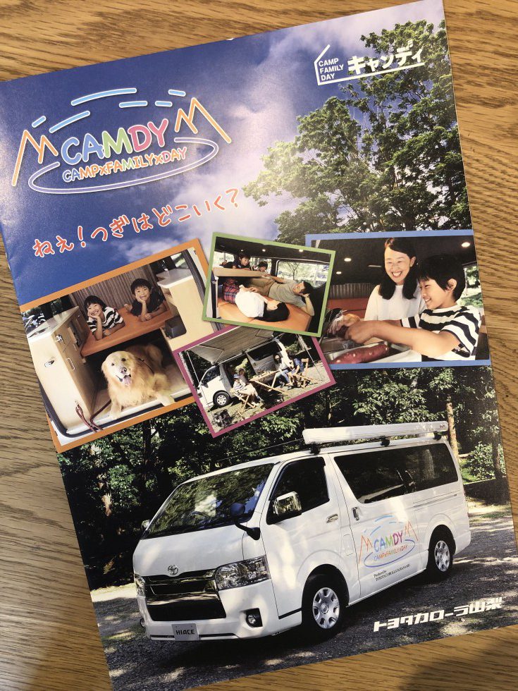 トヨタカローラ山梨さんから出ている、ハイエースをキャンピングカー仕様にした「CAMDY」という商品のパンフレットに載せてもらいました~👏
