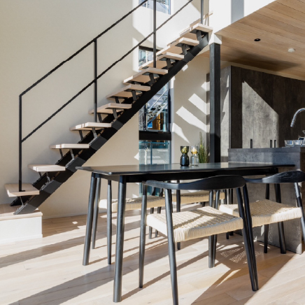 ダイニングからのびる鉄骨で仕上げたストリップ階段はもはやインテリアの一部。&Trunkの代表的なデザインです。
