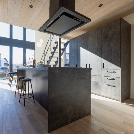 LDKの雰囲気を損なうことなくカッコ良さを引き立たせるキッチン。アイランド型が使い方の可能性を増やします。