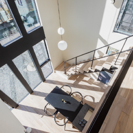 ダイニングからのびる鉄骨で仕上げたストリップ階段はもはやインテリアの一部。&Trunkの代表的なデザインです。