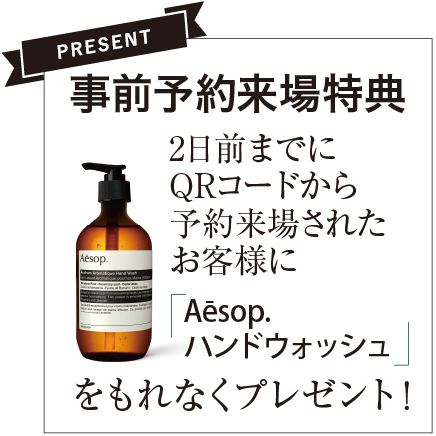 2日前までにQRコードから予約来場されたお客様に「Aesopハンドウォッシュ」をもれなくプレゼント!