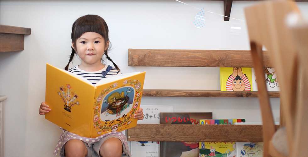 しかし、見学会やイベント等に足繁くご主人と通い、「いろいろなことに参加してMamanの家を見ていくうちに、全部の家が一緒のデザインじゃない。それぞれが個性を出していて、オプトさんでなら自分達の家が作れる!と感じていました」と、ご主人はわくわくする気持ちに動かされたそうです。 奥様から提案したキッチンカウンターに設けた『ブックラック』。今では「Mamanの家」を選ぶママ達が、我が家にも!と取り入れるという人気ぶり。彩葉ちゃんも大好きな本を自分で取れる…自然に持ってこれるように…そんな思いが込められています。
