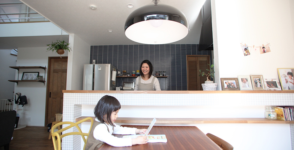作りつけのTV台。大容量のパントリー。ダイニングキッチンから続くようにウッドデッキを設けたことで、家中が広く感じられ開放的な気分に。そして、奥様が一番こだわったキッチンの背面タイルがスパイスのようにピリッと効き、スタイリッシュな空間を作り出しました。 これから、この家で育んでいく家族のじかん。笑ったり、ときには泣いたり…。そのひとつひとつを大切に「いつでも人が集まってくるような家、場所でありたいです。いずれ子どもたちは巣立ちます。その頃には、この床材もつやを放ち良い色に変わっていることでしょう。主人と私の満点以上の「終の棲家」です。」と…。