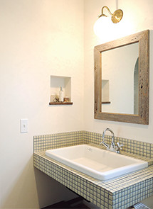 2人の転機は、見学に行ったMamanの家を見たあの日。「奥さんが家を建てたいことも知っていましたし、何より彼女が大好き僕めていたアンティークの家具や小物が、かっこいい中にやわらかいその家にぴったりで。こういう雰囲気で建てられるのなら家を持とう!となったんです」。見学に行く以前は、平屋の家を持ちたいと思っていた奥様でしたが、「この家がいい!と、描いていた家はどうでもよくなっていました(笑)」。 そして2人、山梨にいよう、定住しよう、家を建てようとなりました。もちろん「ここにいるって決めたのは、オプトさんがいたからなんです」。 アンティークのインテリアに合うように施された黄味を帯びた漆喰。キッチンを隔て電化製品を見せないようにしたスペース。大好きなカフェを真似たカウンター。溢れすぎた靴をコレクションの ように収納できるシューズクローク。幅までこだわったニッチ。奥様の趣味の部屋とご主人の書斎のプライベート空間。