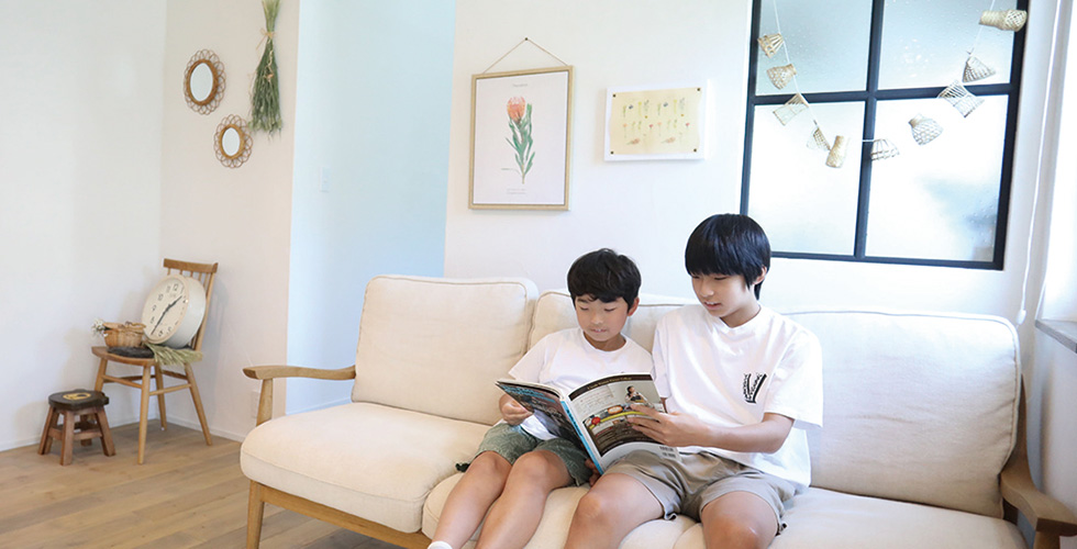 のんびりゆったりと暮らすH様ご家族。リビングから続く小上がりの一室にあるカウンターはご主人のお気に入りで、お子さん含め、勉強したり本を読んだり、窓から見える変わりゆく四季の景色を眺めたり、一人ひとりの居場所を慈しむ場所になりました。