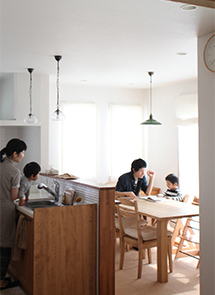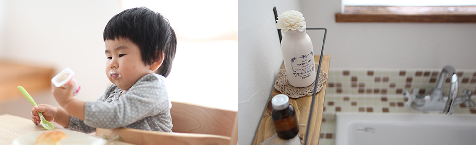 夫婦二人だけの生活の時からモデルハウス等を見学しに行っていたK様ご夫婦が、家作りの現実味を帯びてきたのは、もちろん聡太くんが誕生したから。数々の会社を巡っていたある日、奥様の目にオプトホームの写真が飛び込んできました。「かわいい♪」…それが第一印象。その後、オープンハウスに出かけ、外観の可愛らしさをはじめ、瓦・漆喰の内壁・テラコッタタイル・天然素材etc、“イメージにぴったり”と、この時すでに奥様の中ではオプトホームに決まったそう。