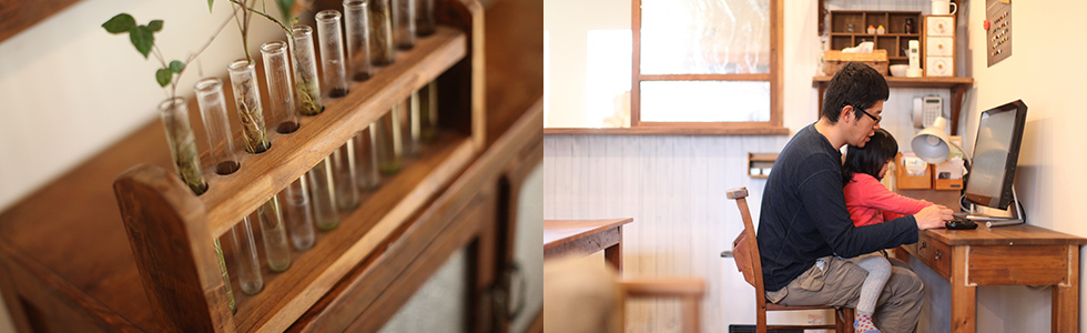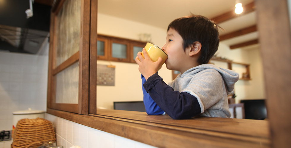 なくとけ込んでくる和室など、機能性も兼ね備えられているのは家作りのお手本にしたいほど。「家族がいろいろなことを、ここでやっていきたい。勉強するのも何をするのも成長をここから見守っていきたい」と言う“ここ”は、みんなが大好きなリビング。そのリビングは、受け継がれてきた棚、廃材から拾ってきた椅子、重厚な深みのあるダイニングテーブル、キッチンとを繋ぐ窓、趣のある小窓に加え、置いてある小物たちでぐっと雰囲気を良くし、まるでレトロなカフェのような空間。楽しく笑えていればそれでいい… H様家は今日もほっこりゆったり歩んでいきます♪