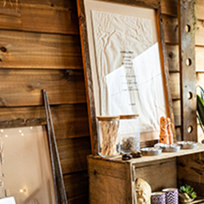 ラフに張られた白い板ばりと塗り壁の塗装がアンティーク感を演出。