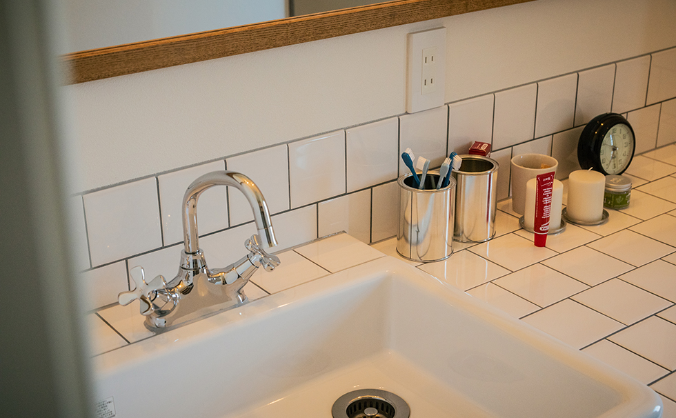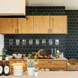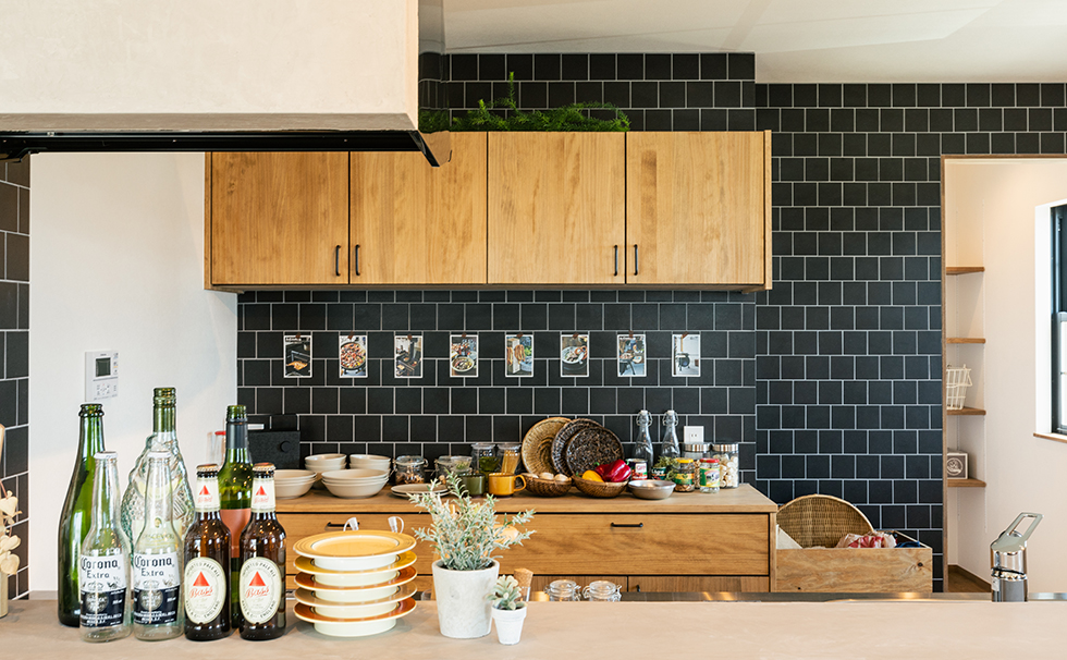 2人で立つキッチンには彼の好きな黒いタイルを張りめぐらせて。