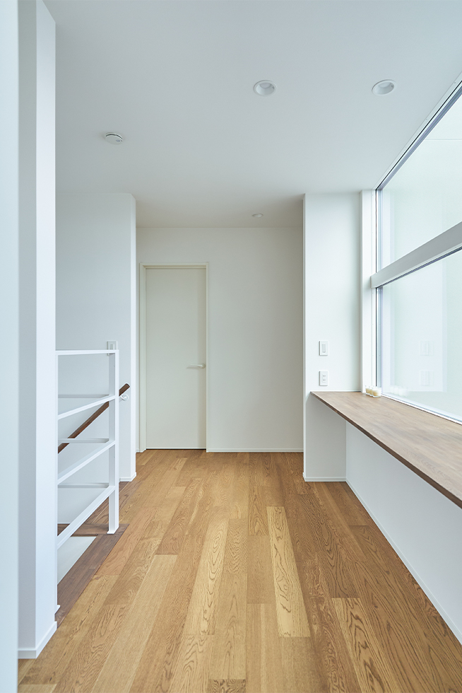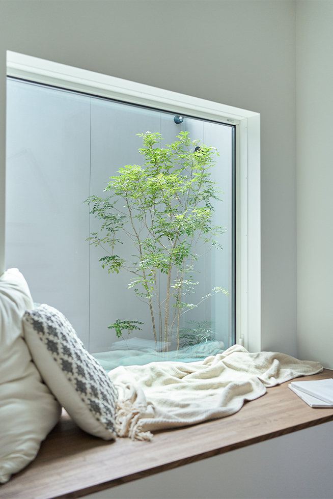 コートハウスのあるこの家は明るい光がたっぷりとふりそそぐ。リビングから見上げる空は晴れの日も曇りの日もそこにあって、私たちの景色になる。