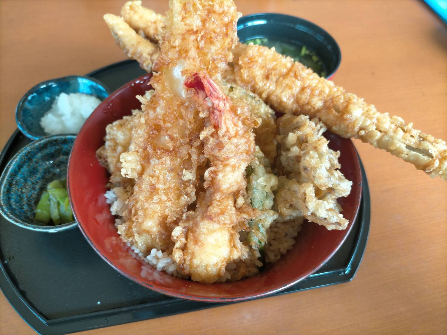 牧丘にある「はくさい」の天丼。穴子がデカイ…いや、全てのタネがデカイ!デカ盛りでしたがなんとか完食出来ました!胃もたれもなく美味しくいただきました😄