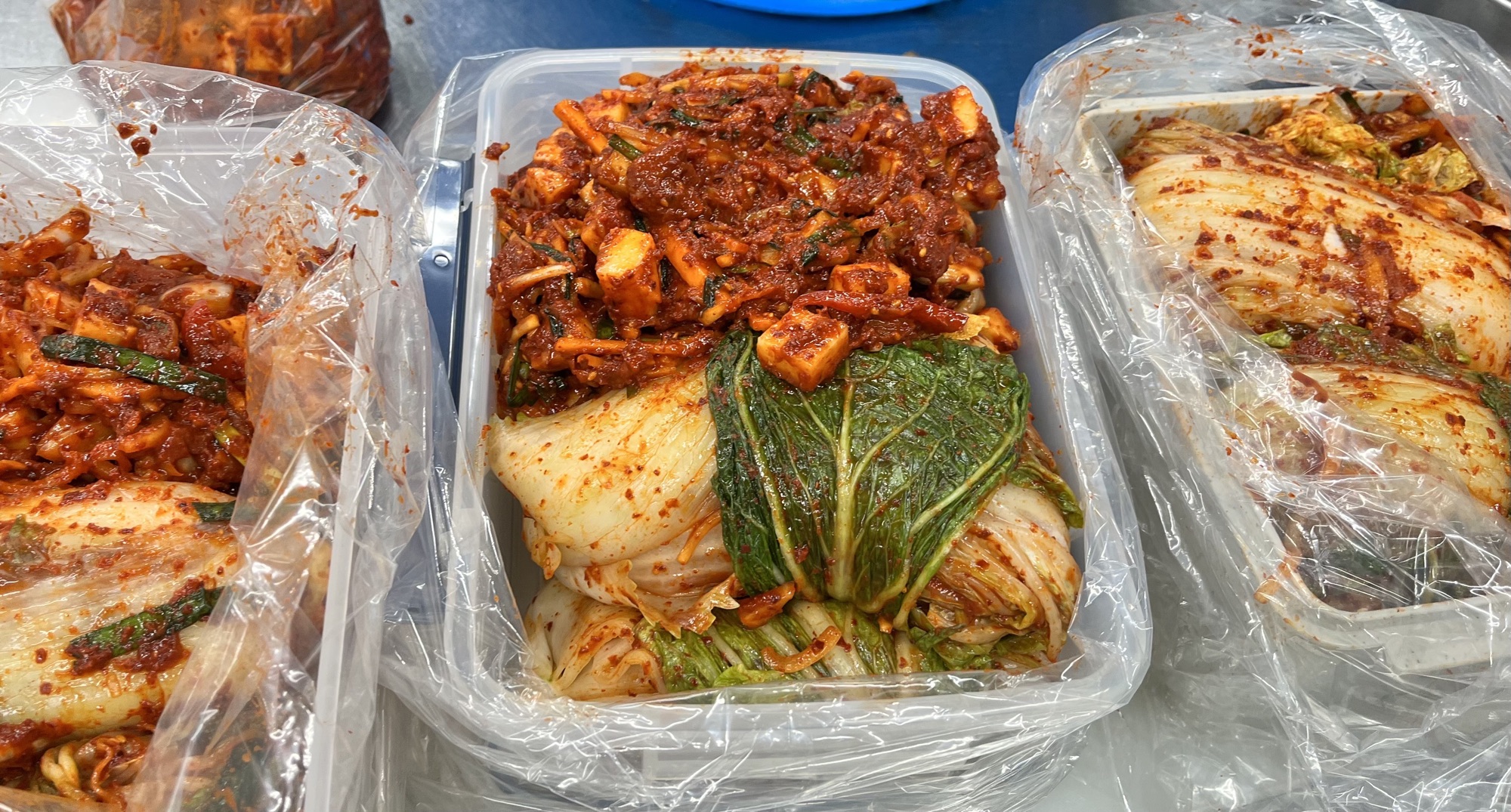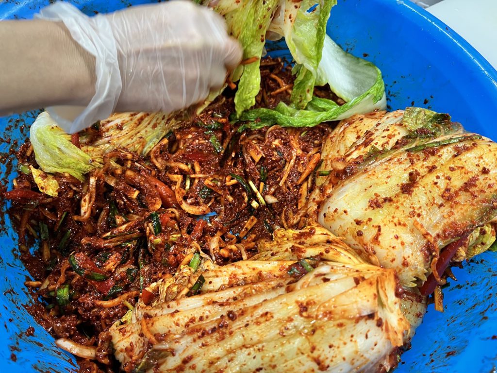 白菜の塩漬けは、約6時間掛かり途中で上下を入れ替える作業があり、今回は、先生がここまでの作業をした白菜を使用したので、約2時間で白菜キムチとおまけのカクテキの2種類が完成!