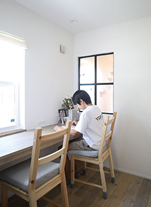 のんびりゆったりと暮らすH様ご家族。リビングから続く小上がりの一室にあるカウンターはご主人のお気に入りで、お子さん含め、勉強したり本を読んだり、窓から見える変わりゆく四季の景色を眺めたり、一人ひとりの居場所を慈しむ場所になりました。