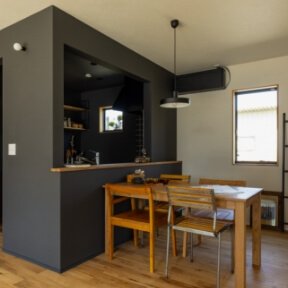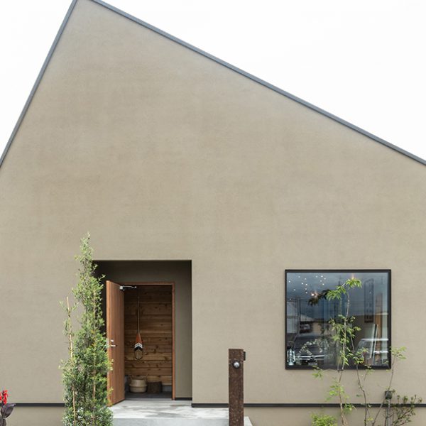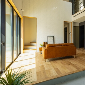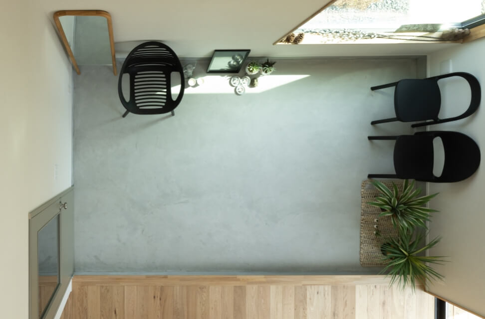 玄関を入ると、土間がリビングへとゆるやかに続き、