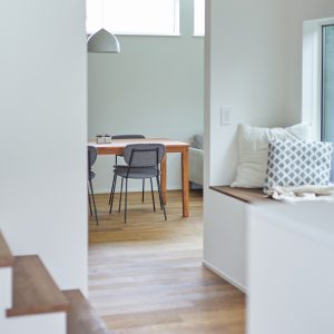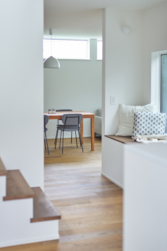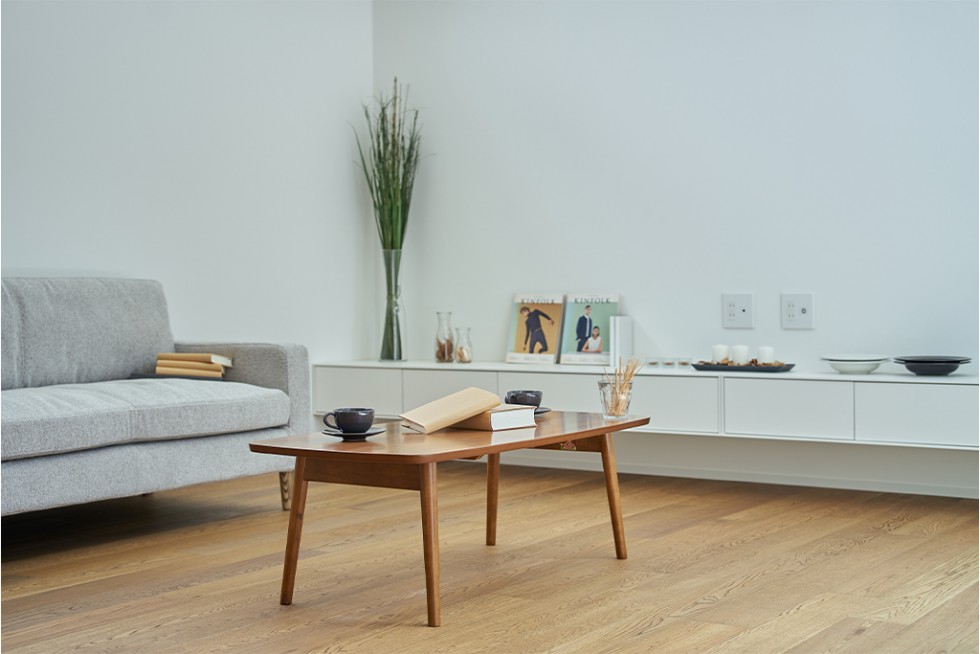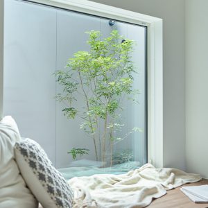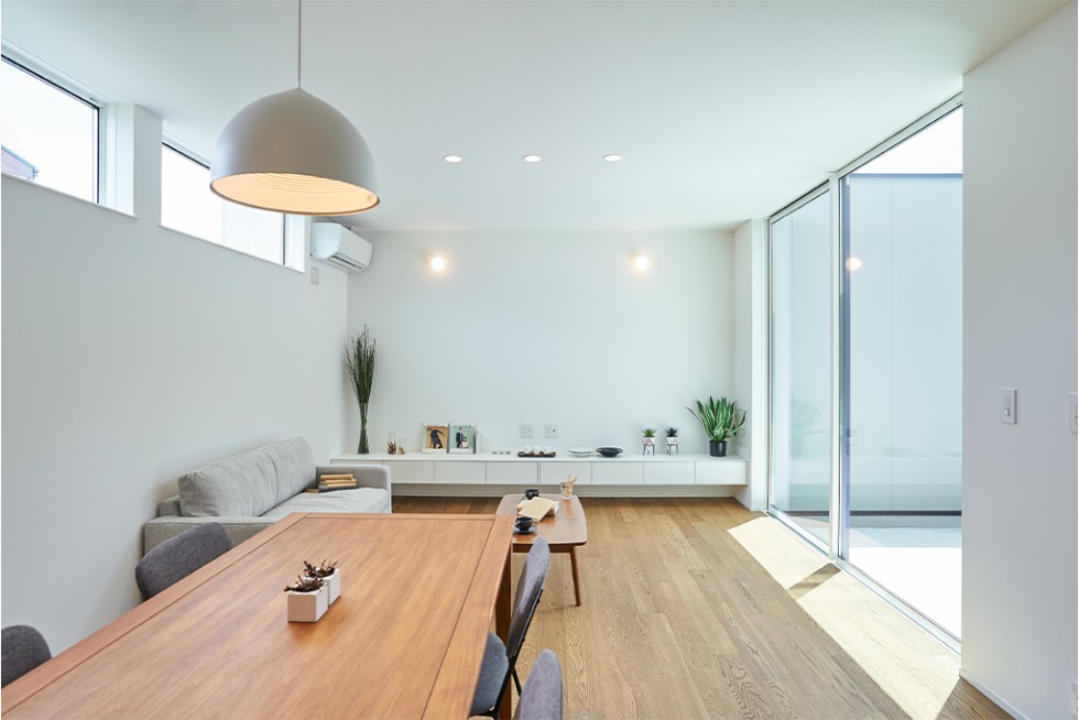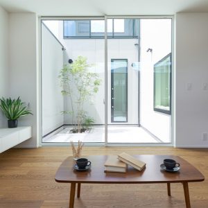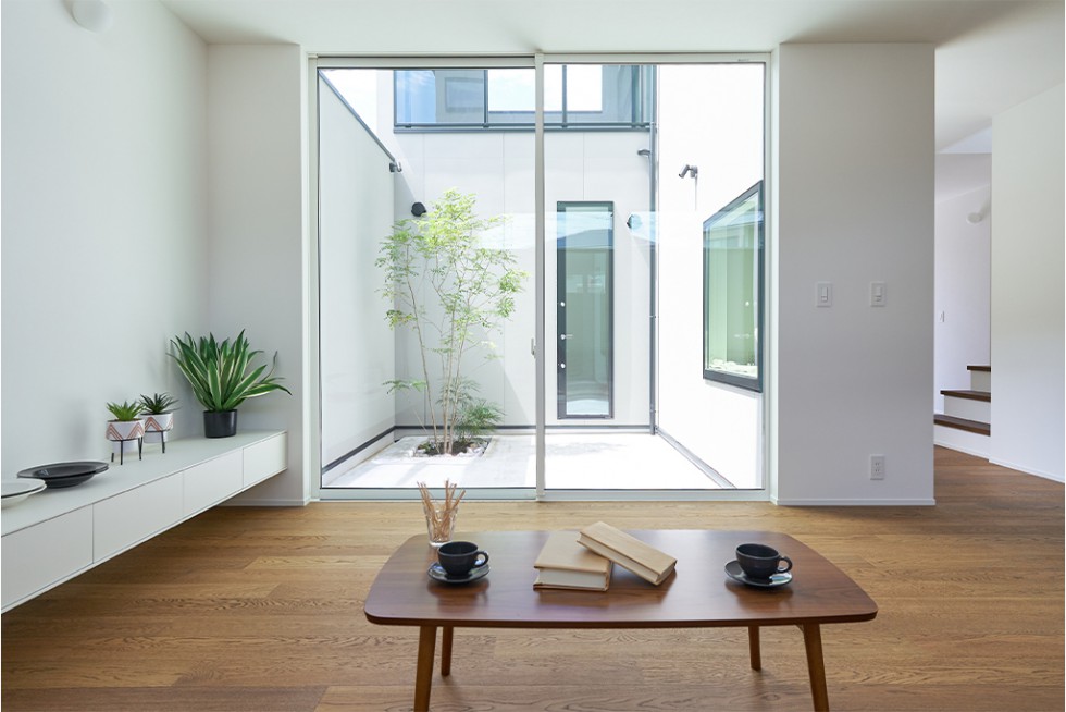 コートハウスのあるこの家は明るい光がたっぷりとふりそそぐ。リビングから見上げる空は晴れの日も曇りの日もそこにあって、私たちの景色になる。